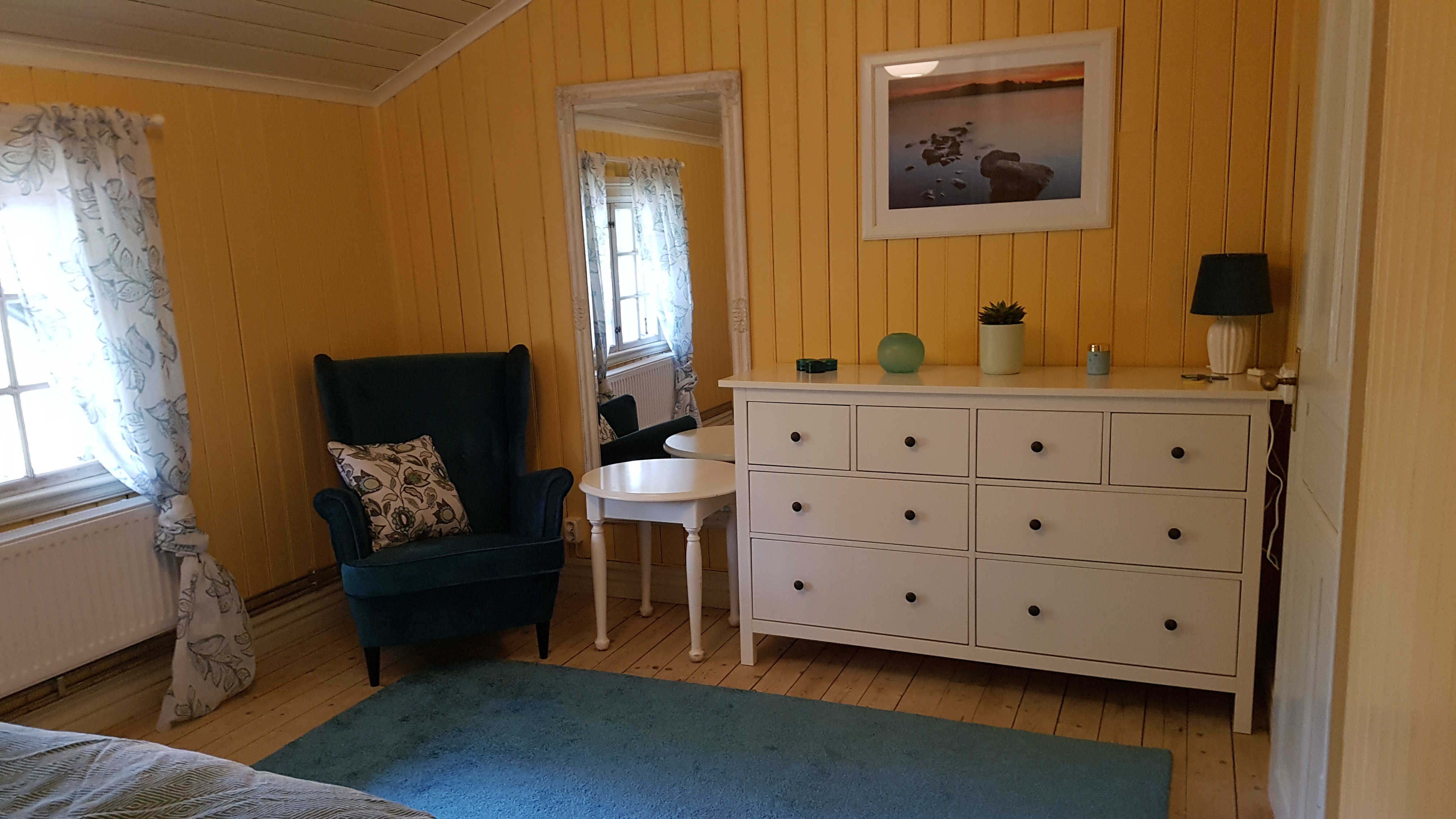 Det Turkosa rummet har dubbelsäng, stor byrå, helkroppsspegel, mysig matta och en skön fotölj. Plats finns för att vid behov ställa in en hopfällbar extrasäng eller spjälsäng/juniorsäng.