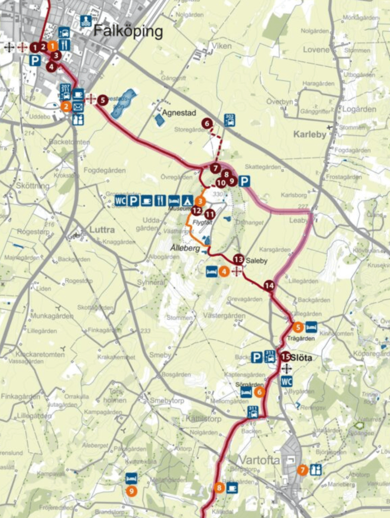 St. Olofsleden Vårkumla-Falköping, går förbi Scarlet Bed & Breakfast , se nr. 4 på den här kartan: